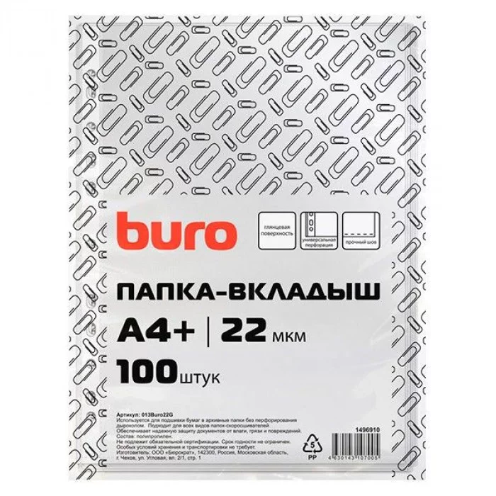 Файл-вкладыш с перфорацией А4+ 22мкм гладкая поверхность 100шт/уп BURO 1496910 314174