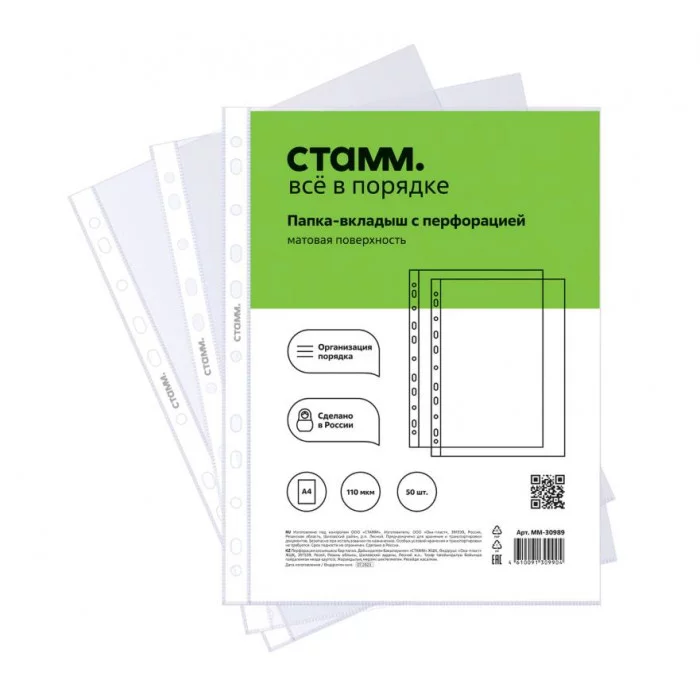 Папка-вкладыш с перфорацией (файл) СТАММ А4, 110мкм, матовая 356696