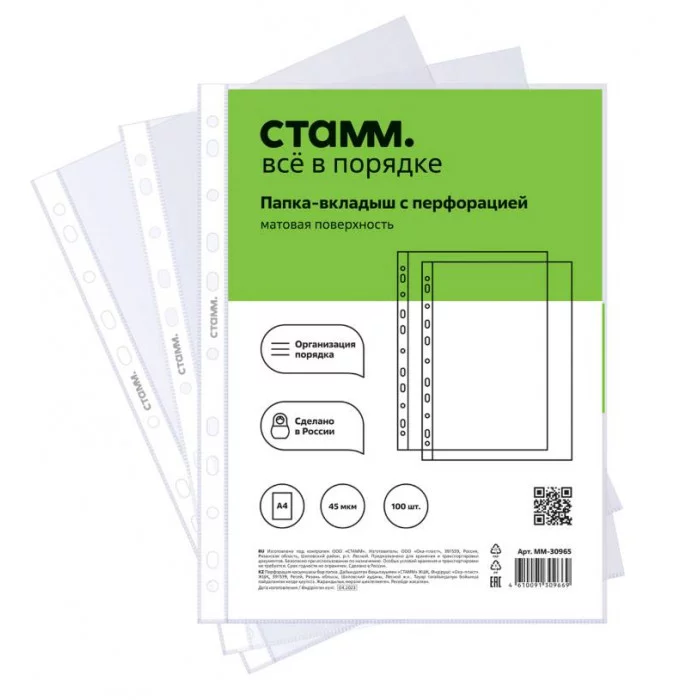Папка-вкладыш с перфорацией «СТАММ» отлично подойдет для хранения и систематизации документов. Папка размером 305*235 мм изготовлена из полипропилена толщиной 45 мкм. Папка вмещает до 50 листов. Имеет матовую текстуру, защищает листы от внешних воздействий. Перфорация на боковой части позволяет разместить изделие в папке с любым кольцевым механизмом или скоросшивателем. Упакованы в пакет по 100 штук.