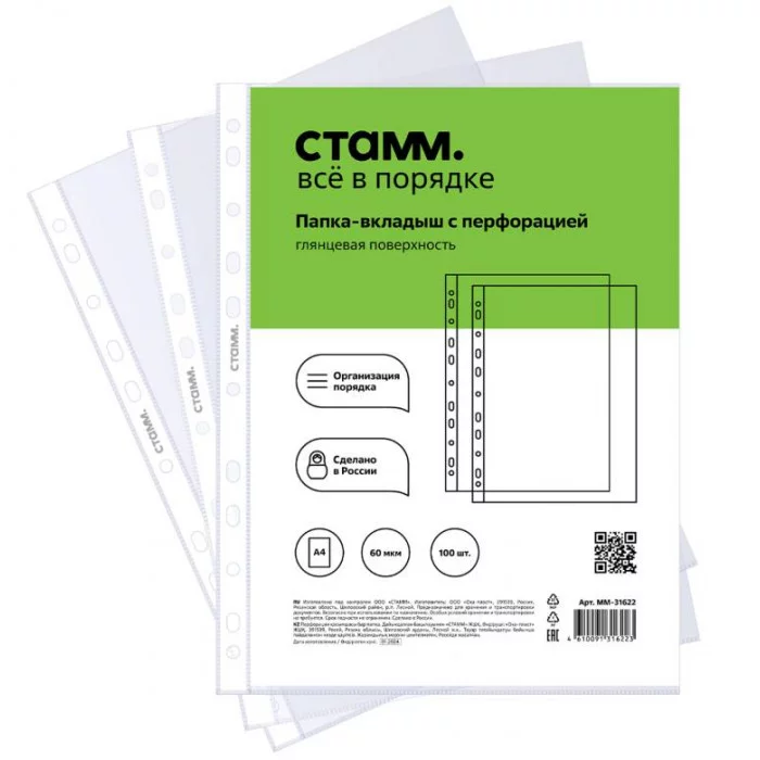 Папка-вкладыш с перфорацией (файл) СТАММ А4, 60мкм, глянцевая 368387