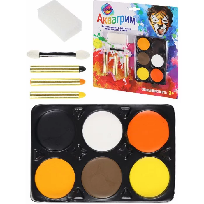 Набор аквагрима поможет украсить любой детский праздник или театральную постановку! С ним будет легко фантазировать и украшать лица рисунками, узорами, создавать любой образ. Краски легко наносятся и смываются, безопасны для детской кожи. В комплекте: 6 цветов (чёрный, белый, алый, оранжевый, коричневый, жёлтый), 3 карандаша (чёрный, оранжевый, жёлтый), 1 спонж и 1 аппликатор. Упаковка: планшет.