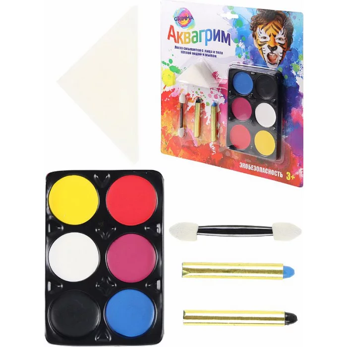 Набор аквагрима поможет украсить любой детский праздник или театральную постановку! С ним будет легко фантазировать и украшать лица рисунками, узорами, создавать любой образ. Краски легко наносятся и смываются, безопасны для детской кожи. В комплекте: 6 цветов (чёрный, белый, жёлтый, голубой, ярко-розовый, красный), 2 карандаша (чёрный, голубой), 1 спонж и 1 аппликатор. Упаковка: планшет.