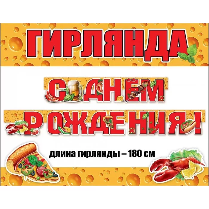 Гирлянда для самых позитивных мужчин, которые обожают веселье! Яркий дизайн с изысканными деликатесами, придется по душе даже самым заядлым ЗОЖникам! Данная гирлянда выполнена из плотного высококачественного картона, а элементы скреплены между собой с помощью подвижных металлических соединений, на концах гирлянды имеются небольшие отверстия через которые можно пропустить тонкую ленту для удобства крепления, также гирлянда легко закрепляется на стене с помощью обычных канцелярских кнопок.
