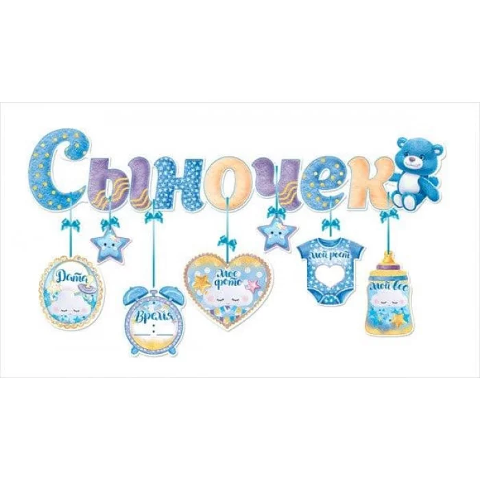 Рождение сыночка — большое и радостное событие! Очаровательная гирлянда с подвесками-метрикой украсит комнату в такой чудесный день. Гирлянда-растяжка с надписью «Сыночек» дополнена 7 подвесками, в которые можно вклеить фото малыша, а также вписать самые важные сведения: имя, дату, время рождения, рост и вес. Размеры надписи — 913х179 мм. Все элементы изготовлены из плотного картона. Материал хорошо держит форму. Собрать гирлянду очень просто. Для этого разрежьте ленту на необходимое количество частей разной или одинаковой длины, привяжите к подвескам из набора и украсьте гирлянду по своему вкусу, создав индивидуальный декор. Затем закрепите гирлянду на стене любым удобным способом. Для крепления к стене можно использовать обычные булавки, канцелярские кнопки или скотч. Гирлянда станет отличным дополнением детского уголка. А еще с помощью такой растяжки можно создать фотозону и организовать фотосессию.