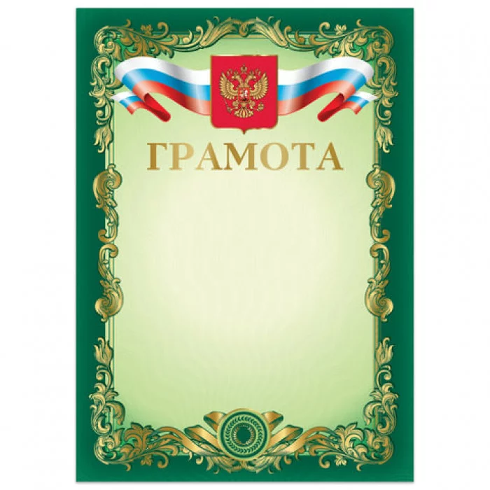 Грамота с изображением российской символики. Предназначена для награждения за заслуги в учебе, спорте, трудовой деятельности. Изготовлен из импортного мелованного картона плотностью 200 г/м2. Составляется в свободной форме. Имеется изображение российской символики. Формат А4. Заголовок: "Грамота". Назначение: универсальная. Формат: А4. Материал: импортный мелованный картон. Плотность: 200 г/м2. Изображение российской символики: да. Дизайн: Зеленая. Оформление надписи: без спецэффектов Бренд - BRAUBERG. Производитель - Россия. Артикул - 126548. Штрихкод - 4606224110141