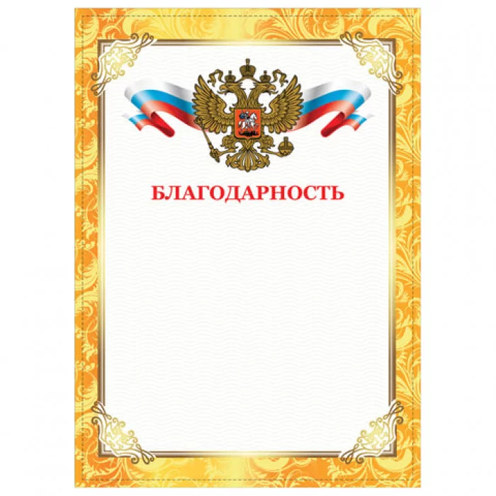 Грамота для объявления благодарности с изображением российской символики. Изготовлена из плотной мелованной бумаги плотностью 200 г/м2. Составляется в свободной форме. Имеется изображение российской символики. Формат А4. Заголовок: "Благодарность". Назначение: похвальная. Формат: А4. Материал: плотная мелованная бумага. Плотность: 200 г/м2. Изображение российской символики: да. Дизайн: Золотая. Оформление надписи: без спецэффектов Бренд - STAFF. Производитель - Россия. Артикул - 128899. Штрихкод - 4606224178615