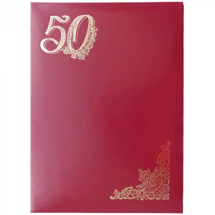 Папка адресная OfficeSpace серии «50 лет» формата А4 идеально подойдёт для поздравления с юбилеем. Изделие выполнено из прочного картона красного цвета с покрытием из бумвинила. Обложка изделия украшена тиснением из фольги. Внутренний способ крепления документов – лента-ляссе. Папка выпускается в индивидуальной упаковке. Формат: А4; Материал обложки: бумвинил; Тиснение: фольгой; Способ фиксации документов: лента-ляссе; Цвет: красный.
