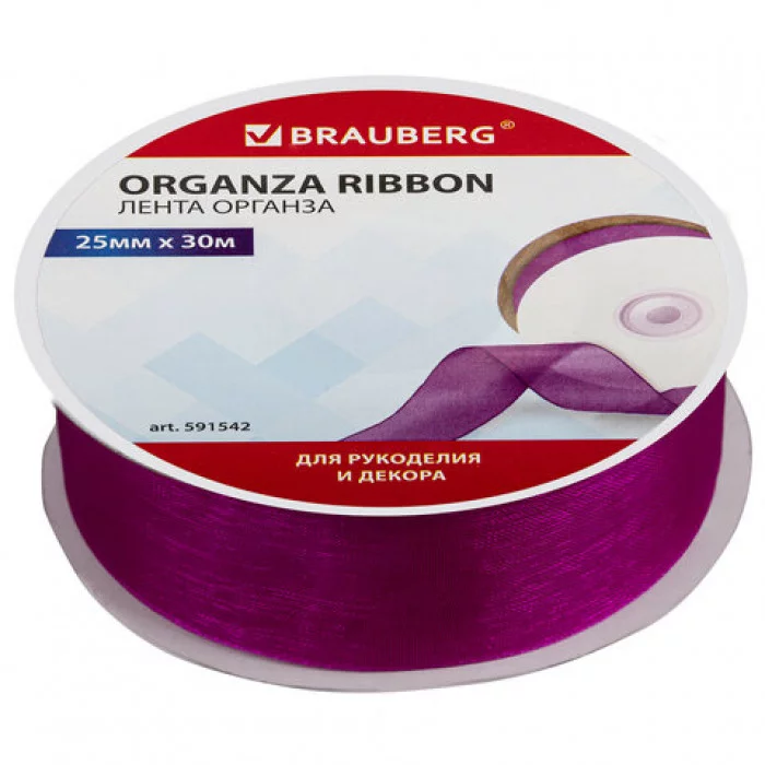 Лента из органзы BRAUBERG предназначена для оформления подарков, рукоделия, декора, а также она широко используется во флористике для оформления букетов и цветочных композиций. Изделие представляет собой ленту из органзы фиолетового цвета, изготовленную из 100% нейлона, с ткаными кромками на обоих краях. Кромка на краях лент выполнена с применением нейлоновой нити. Лента изготовлена с применением атласного способа переплетения нитей. Лента шириной 25 мм (± 3%) и длиной 30 м намотана на картонный рулон с пластиковой втулкой и упакована в прозрачный полипропиленовый пакет, содержащий этикетку с краткой информацией о товаре. Ширина ленты: 25 мм. Длина: 30 м. Количество в комплекте: 1 шт.. Количество цветов: 1. Цвет: фиолетовый. Материал: нейлон Бренд - BRAUBERG. Производитель - Китай. Артикул - 591542. Штрихкод - 4606224293332