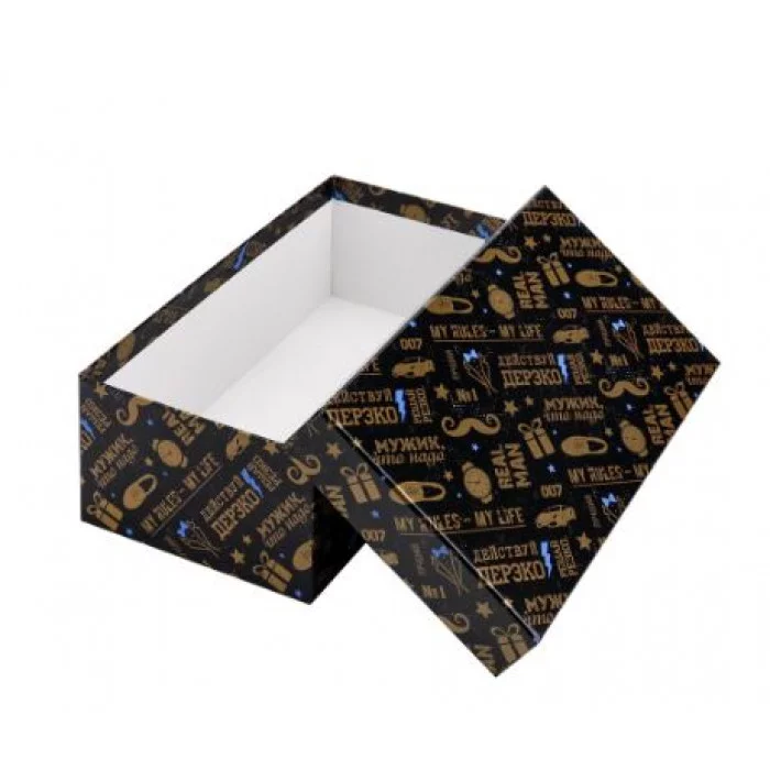Прямоугольная коробка с интересным дизайном поможет создать яркие и запоминающиеся подарки, которые приятно дарить и получать. Лёгкая и прочная коробка защитит содержимое от повреждений и сохранит аккуратный внешний вид в течение длительного времени, что позволит использовать её ещё и дома для хранения полезных мелочей.
