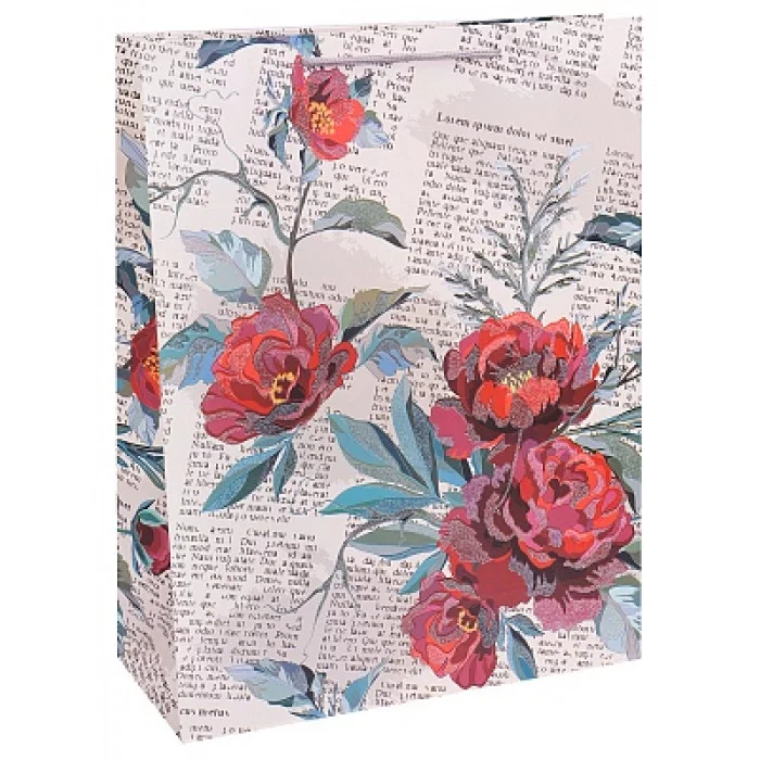Dream cards Пакет подарочный с мат.лам. и глиттером 31х42х12см (XL) Газета красными цветами, 210 г ПКП-2611