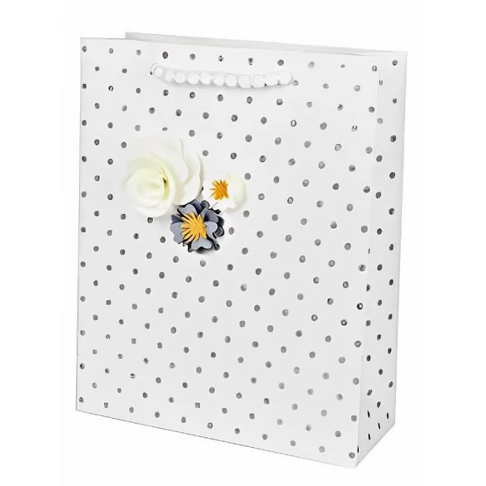 Подарочный пакет идеально подойдет для эксклюзивной упаковки любого подарка! Интересный дизайн усилит приятное впечатление от презента. Пакет с матовой ламинацией, серебристым глиттером и цветами. Хорошо держит форму. Плотность: 210 гр. Размер: М (18х10х23 см).