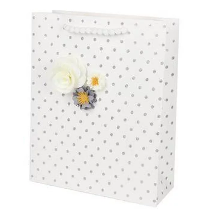 Подарочный пакет идеально подойдет для эксклюзивной упаковки любого подарка! Интересный дизайн усилит приятное впечатление от презента. Пакет с матовой ламинацией, серебристым глиттером и цветами. Хорошо держит форму. Плотность: 210 гр. Размер: L (26х32х10 см).