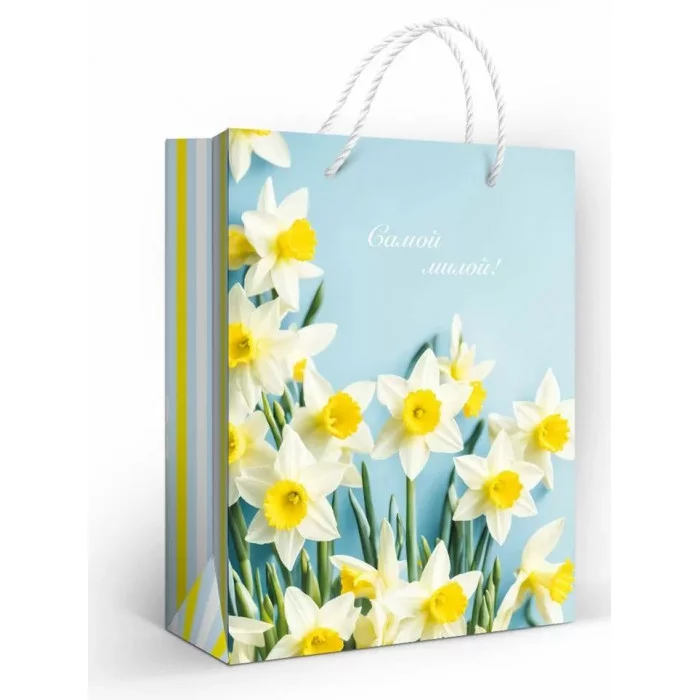 Пакет подарочный (M) "Нарциссы" предназначен для упаковки подарков и имеет привлекательный дизайн с изображением нарциссов. Он подходит для различных мероприятий и праздников, добавляя эстетическую ценность вашему подарку.