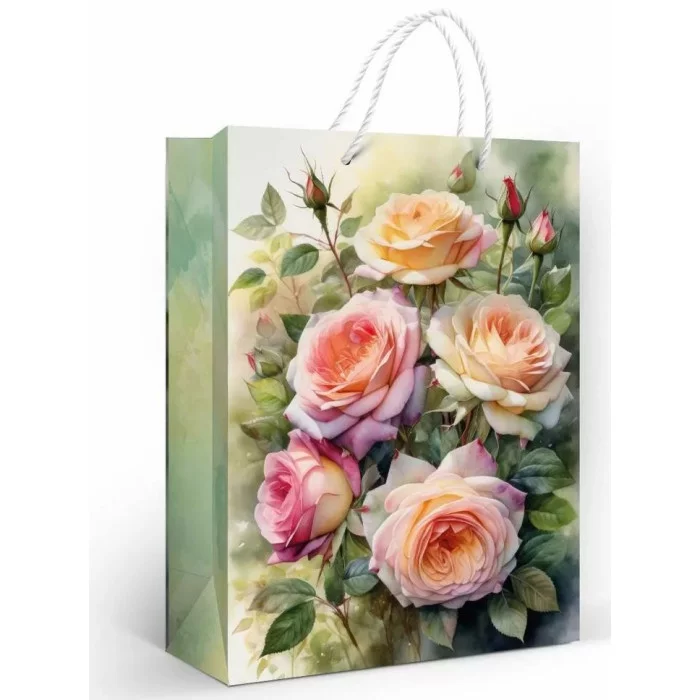 Пакет подарочный (ML) "Кремовые розы" предназначен для упаковки подарков и оформлен с изображением кремовых роз, что делает его подходящим для различных торжеств и мероприятий.
