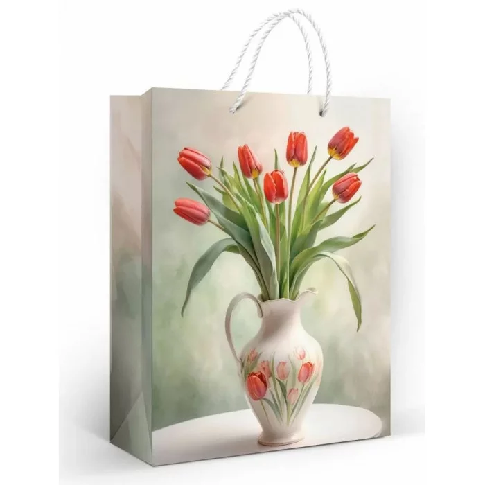 Пакет подарочный (ML) "Кувшин с тюльпанами" предназначен для упаковки подарков и оформлен с изображением кувшина с тюльпанами, что делает его подходящим для различных праздников и мероприятий.
