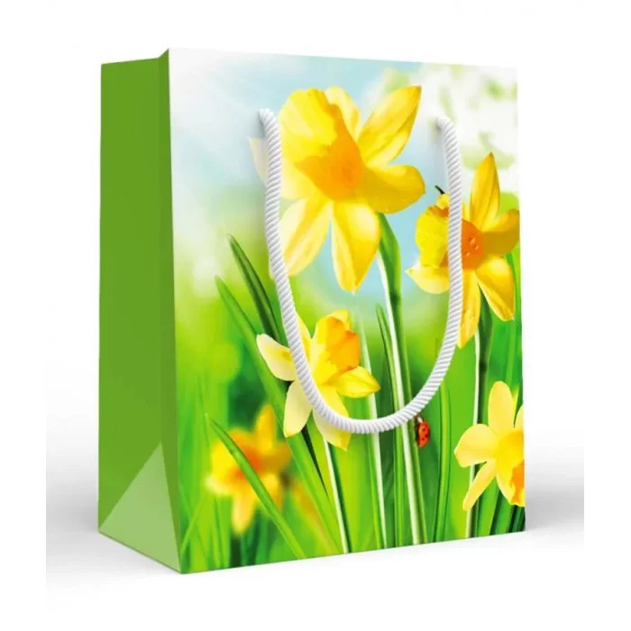 Пакет подарочный (S) "Нарциссы" предназначен для упаковки подарков и оформлен с изображением нарциссов, что делает его подходящим для весенних праздников и других торжеств.