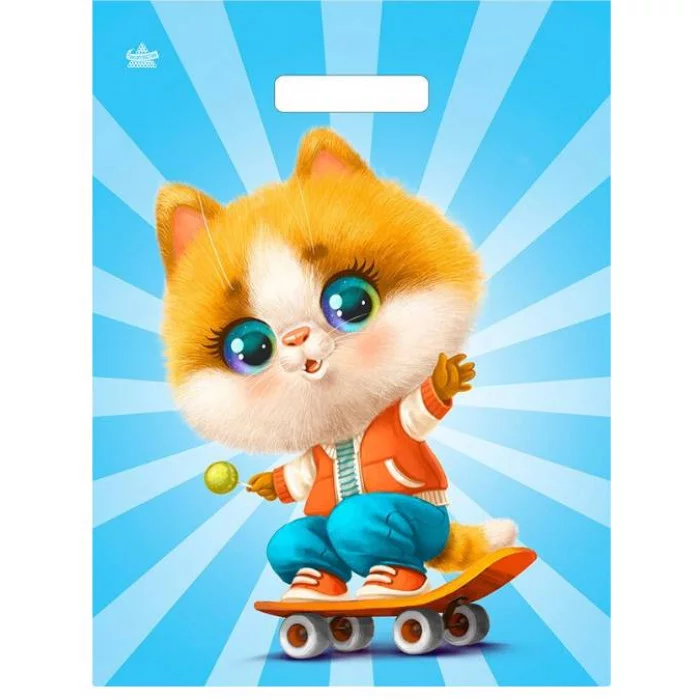 Эта упаковка представляет собой стильный и яркий товар – пакет с прорубной ручкой, украшенный изображением кота на спорте. Пакет выполнен в насыщенных цветах, что делает его заметным и запоминающимся.