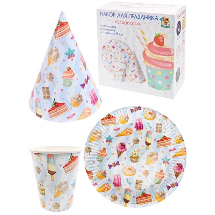 Набор для праздника Сладости (тарелка 6шт, стаканы 6 шт, колпаки шт) ФЛ-6205