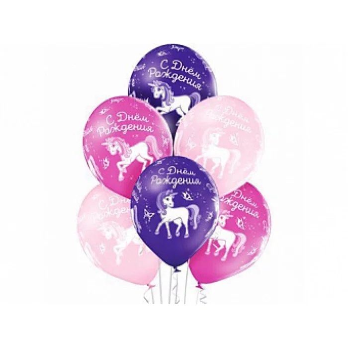 Высококачественный шар из натурального латекса. Пастель. Шары с пятисторонним - круговая печать, шелкографическим рисунком Единорог. С Днем Рождения. Предназначен для розничной продажи воздушных шариков. Ассорти шаров из сереневых, светло и темно розовых цветов. Воздушные шары изготавливаются из экологически безопасного 100%-ного натурального латекса. В окружающей среде разлагаются на безопасные компоненты примерно с той-же скоростью, как обычные листья деревьев. После использования лопнуть и утилизировать как бытовой отход.