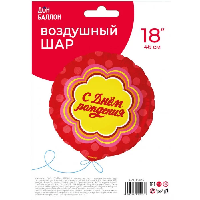 Шар (18\'\'/46 см) Круг, С Днем Рождения, 1 шт. в уп. 13473