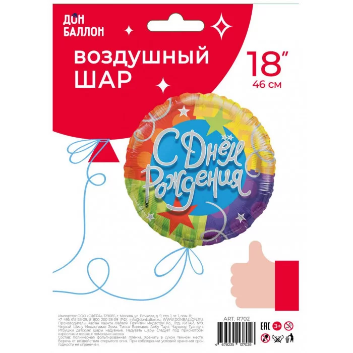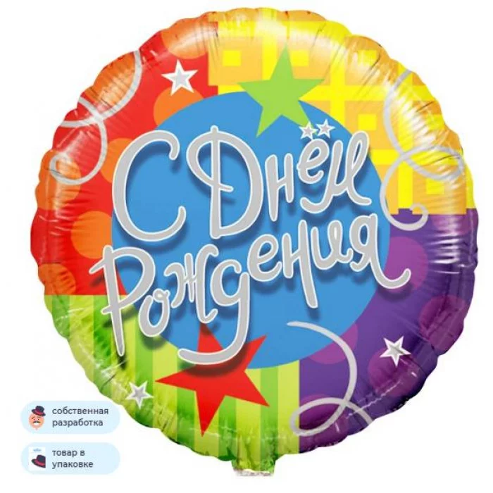Шар (18\'\'/46 см) Круг, С Днем Рождения (звезды и ленты), 1 шт. в уп. R702