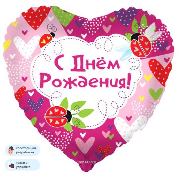 Шар (18\'\'/46 см) Сердце, С Днем Рождения! (божьи коровки), Розовый, 1 шт. в уп. 13335