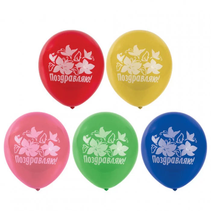 Шары воздушные ЗОЛОТАЯ СКАЗКА, 12" (30 см), КОМПЛЕКТ 5 штук, ассорти 5 цветов, с рисунком "Поздравляю", пакет, 105015