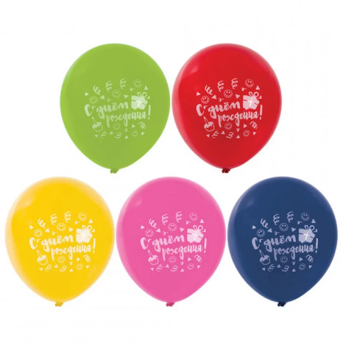 Шары воздушные ЗОЛОТАЯ СКАЗКА, 12" (30 см), КОМПЛЕКТ 5 штук, ассорти 5 цветов, с рисунком "С Днем Рождения", пакет, 105016