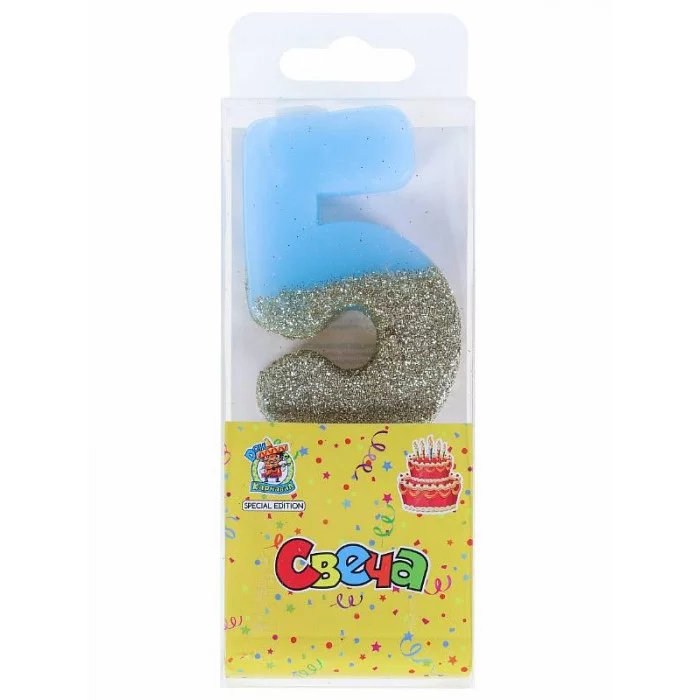 Свеча для торта голубая цифра 5 с блестящим глиттером С-9574