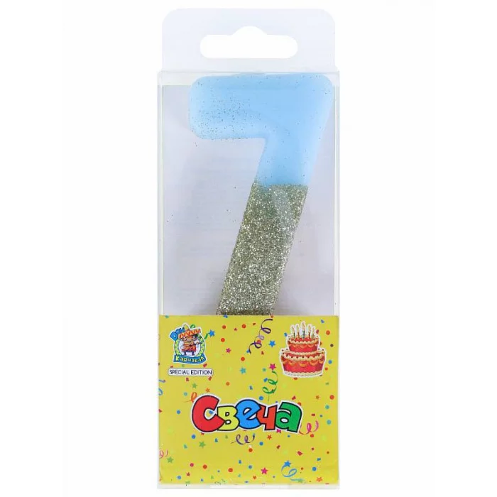 Свеча для торта голубая цифра 7 с блестящим глиттером С-9576