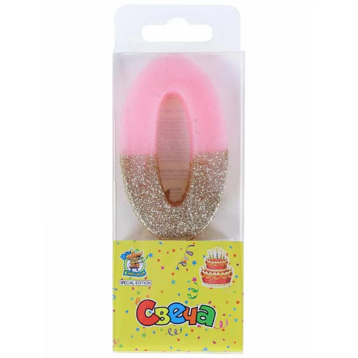 Свеча для торта розовая цифра 0 с блестящим глиттером С-9579