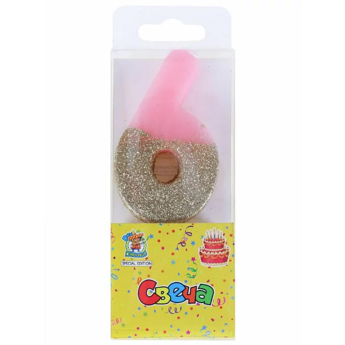 Свеча для торта розовая цифра 6 с блестящим глиттером С-9585