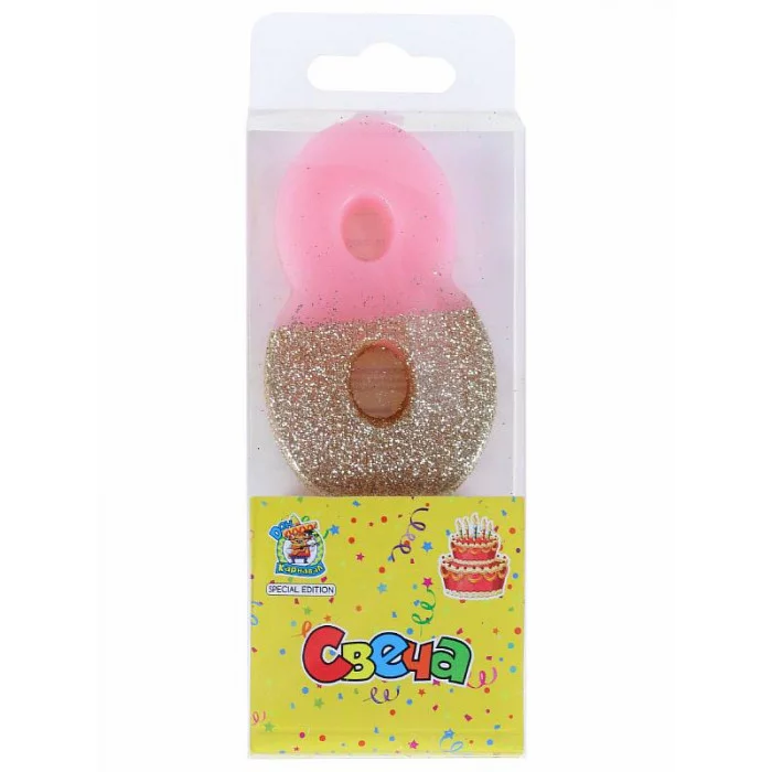 Свеча для торта розовая цифра 8 с блестящим глиттером С-9587