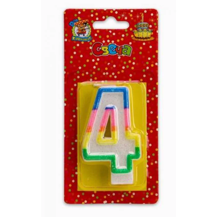 Свеча для торта с разноцветной окантовкой с блестками Цифра 4 С-2419