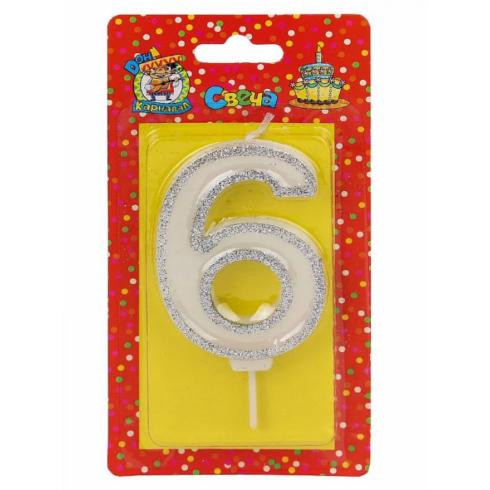 Свеча для торта с серебряной окантовкой (глиттер) Цифра 6 С-5960