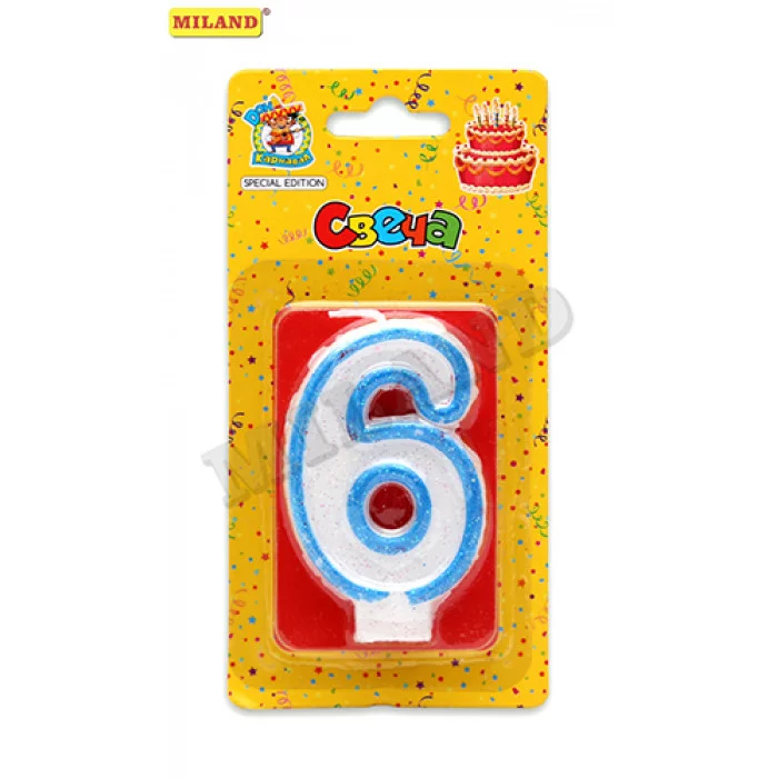 Свеча для торта с синей окантовкой блёстками Цифра 6 С-1104