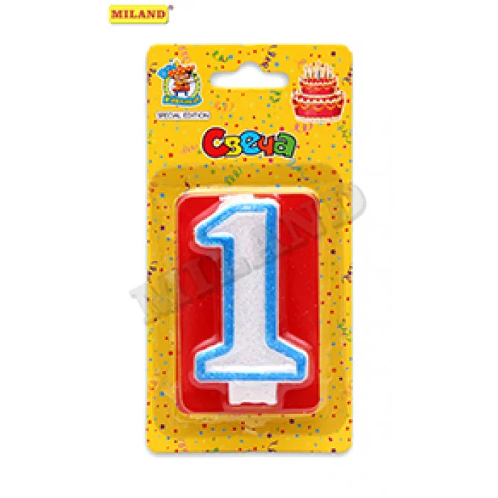 Свеча для торта с синей окантовкой с блёстками Цифра 1 С-1099