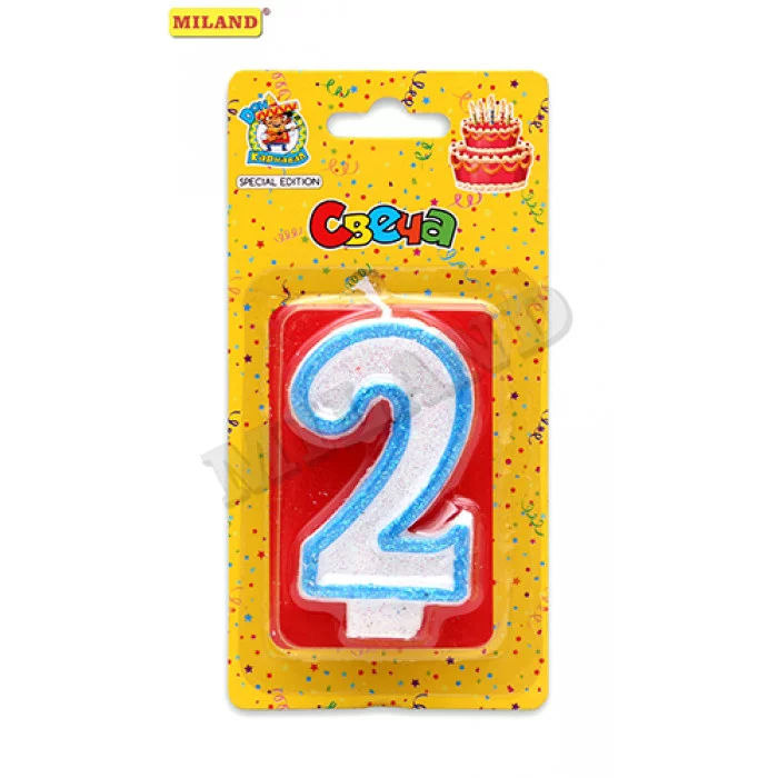 Свеча для торта с синей окантовкой с блёстками Цифра 2 С-1100