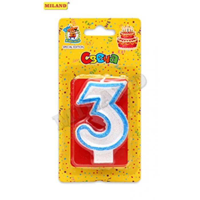 Свеча для торта с синей окантовкой с блёстками Цифра 3 С-1101