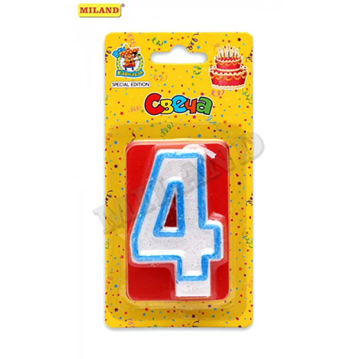 Свеча для торта с синей окантовкой с блёстками Цифра 4 С-1102