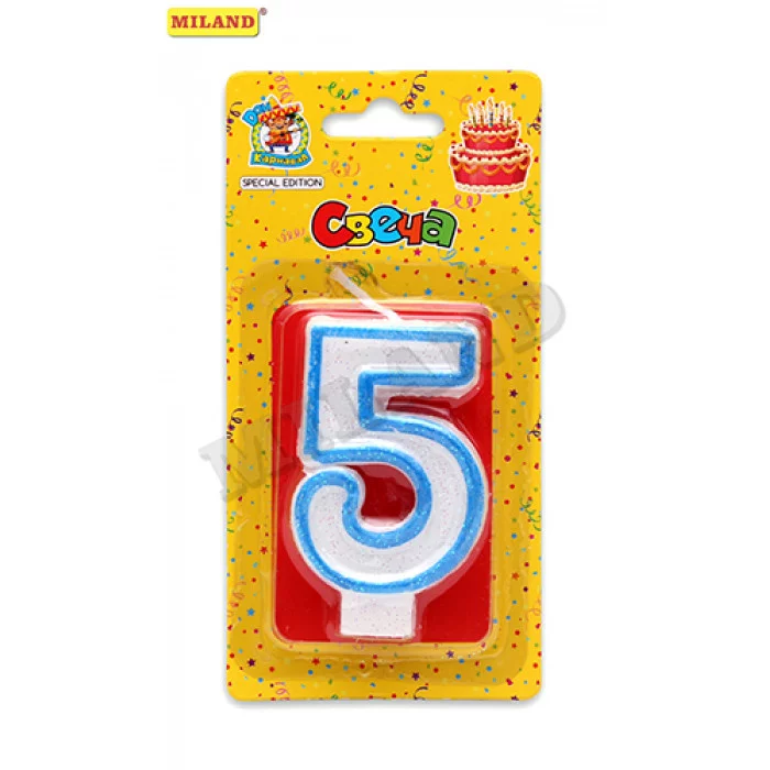 Свеча для торта с синей окантовкой с блёстками Цифра 5 С-1103