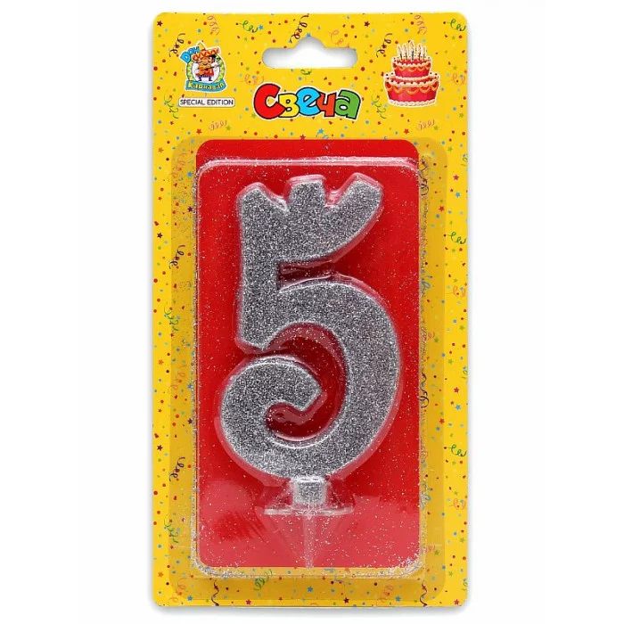 Свеча для торта Серебряный глиттер (большая) Цифра 5 С-1887