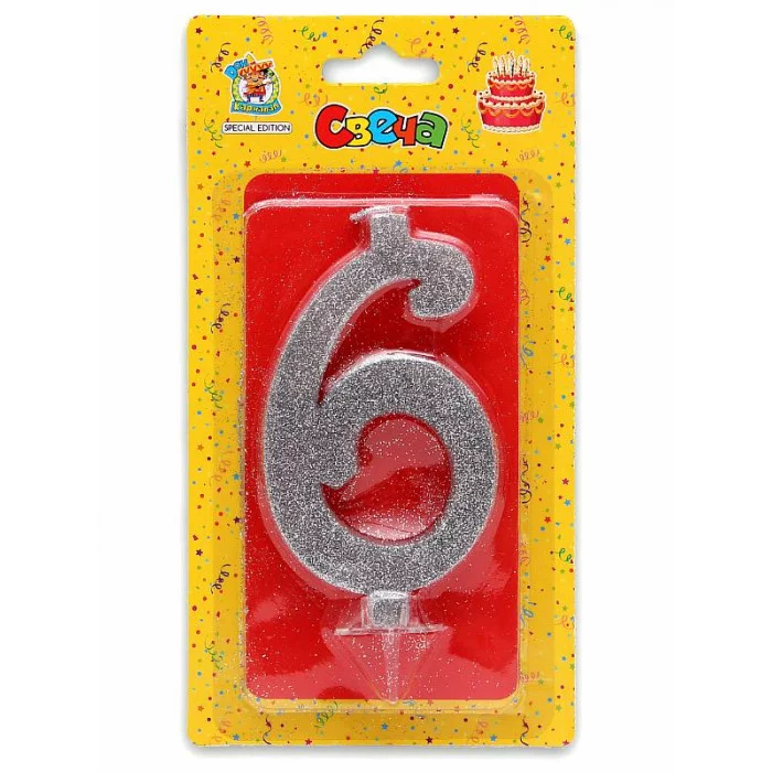 Свеча для торта Серебряный глиттер (большая) Цифра 6 С-1888