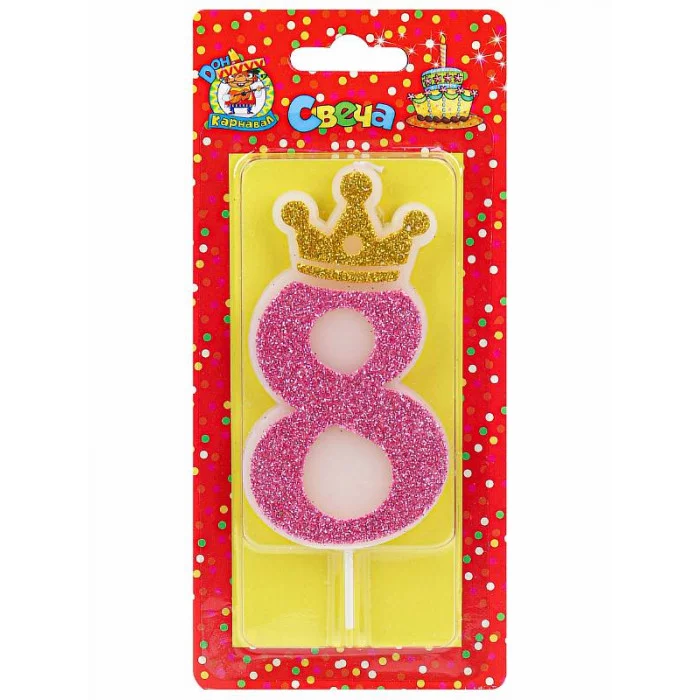Свеча для торта Царская, розовая с глиттером Цифра 8 С-8355