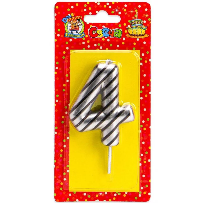 Свеча для торта в полоску, Цифра 4, серебряная С-2523