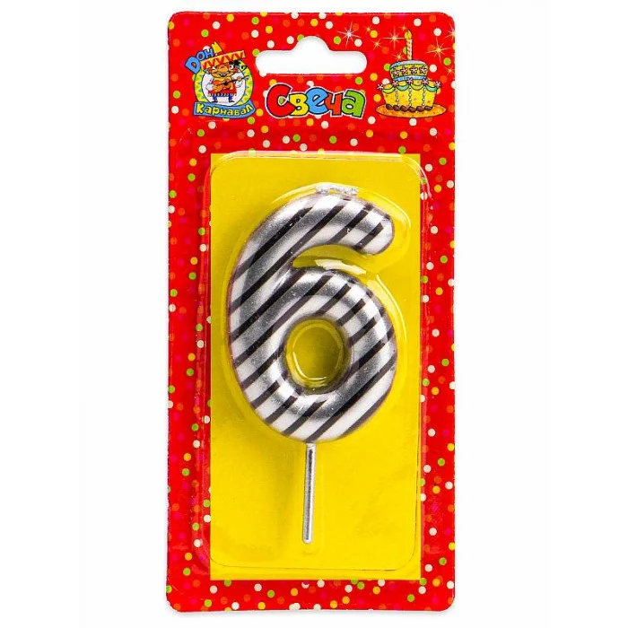 Свеча для торта в полоску, Цифра 6, серебряная С-2525