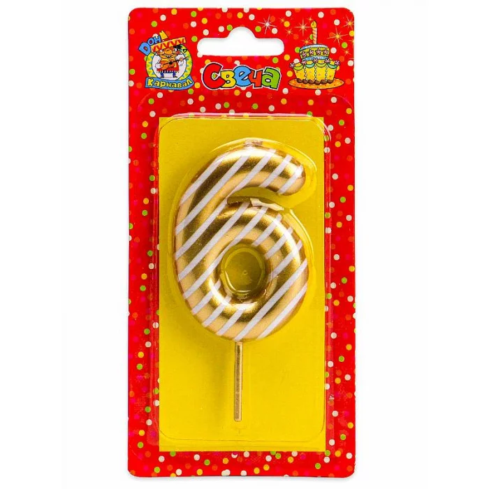 Свеча для торта в полоску, Цифра 6, золотая С-2535