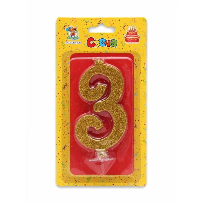 Свеча для торта Золотой глиттер (малая) Цифра 3 С-1821