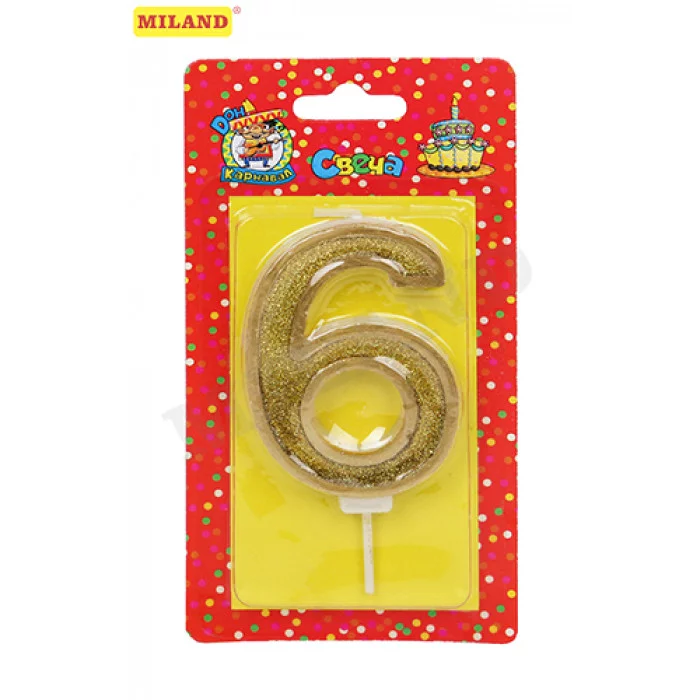 Свеча для торта Золотой глиттер с окантовкой Цифра 6 С-5980