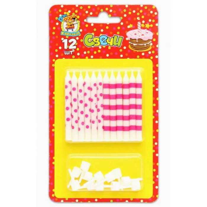 Свечи для торта с подставками. Точки и полосы розовые 12шт. С-0457